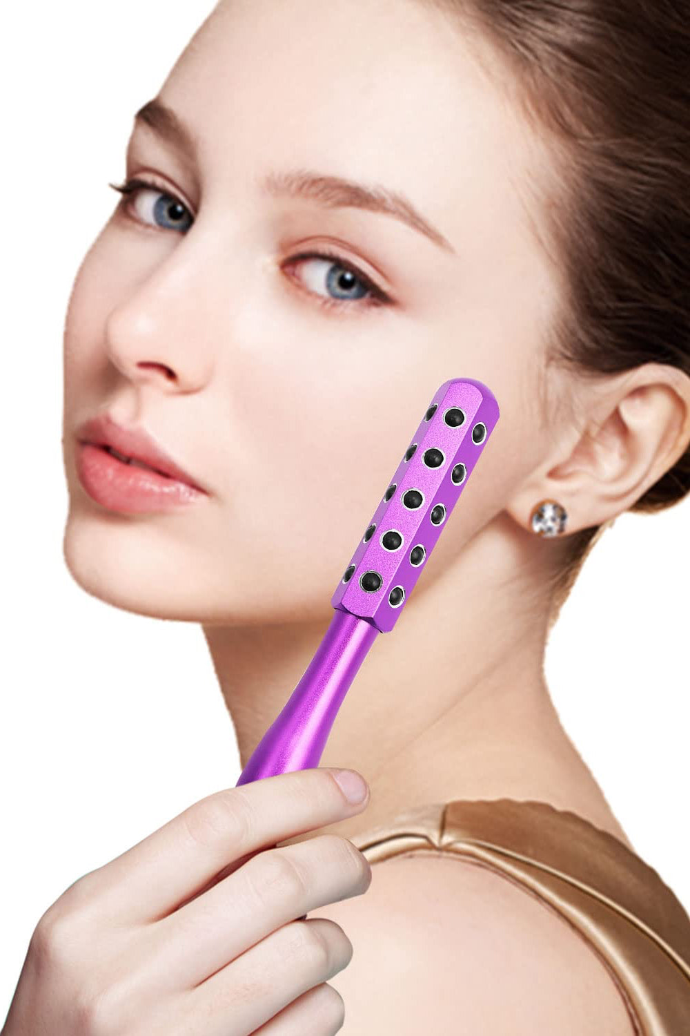 Der Beauty Massagestab ist mit 30 Massagesteinen besetzt. Er kann auf der Gesichtshaut, bei Fältchen um Nase und Mund, zwischen den Augenbrauen, bei Fischschwanzfalten, auf Wangen, Kinn, Brüsten, Armen, Bauch und Oberschenkeln usw. angewendet werden. Verwenden Sie ihn zusammen mit der Wonder Mist Creme oder anderen Schönheitscremes, straffenden Lotionen, Brustcremes oder Schlankheitsgels und reiben Sie ihn sanft mit kreisenden Bewegungen ein, um die Wirkung zu verstärken.